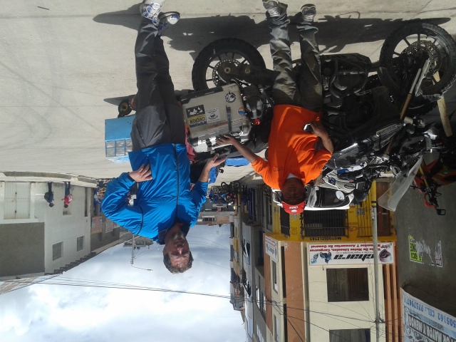 I went to Oscar in the morning. Helped me to be back on the rd by lunch time. A fellow welded the frame of the panniers, we fixed the front fork and the other issues. The owner of the hotel, Gregorio, helped also. Teamwork in Peru at its best. Had difficulties to leave the city again, but with the help of Gregorio and some locals I made it. And a ride was in front of me. Time pressure for limited daylight remaining and off road, following the GPS without seeing the road…. like navigating with the sky. Along a river, passing a archeological site, beautiful as Machu Picchu, following the river, passing “tres canyones”, a place where three canyons meet, light conditions …. just beautiful, some water crossings that really have been challenging, since muddy, but then the highlands, so beautiful… In my last days I will tell from that day… just before sun set started I reached the asphalt road. 20km to Chivay. I farmers boy, probably 10 years old was running aside of the road and trying to make it home before the rain. My bike is fully loaded. Cant take anyone. I asked him. How far? He said “dos kilometros a casa” (Two kilometers till home). I pulled out my left leg; he sat there with his legs on the engine bar and his hands on the warm handle bar. So we went at speed 70km/h through little hale and the first drops of rain, … cold but dry at home. I went on to Chivay. It was just dark when I reached the Plaza de Armas, the central square in all latin cities. I hoed in a coffe shop to get internet and find a place. A lady stepped by and said she has a hotel some blocks away. Off we went and a nice, clean dry place was my rest for night.